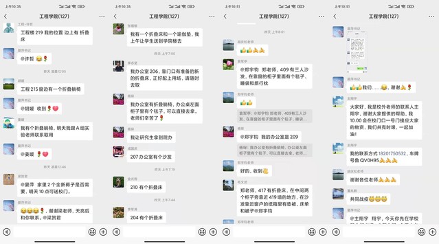 3月13日凌晨,36365线路检测中心入口微信群仍然不断有新消息出现,“我办公室靠门口有新准备的折叠床,请随时去取”“我办公室有折叠躺椅,可以直接去拿”“A组老师辛苦了,需要专车司机接送的联系我,我随叫随到”……为备战校园准封闭状态,确保师生顺利进行在线教学和期间校园生活,学院已有数十名教工主动请缨报名志愿服务,由于在此期间无法出校,得知消息的院内老师纷纷伸出援助之手,于是出现了上述的暖心一幕。疫情就是命令,防控就是责任。老师们的一腔热血,让工程人的防疫之路充满温情。这一刻,工程人用爱筑牢了防疫新阵线。
